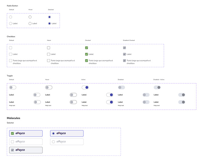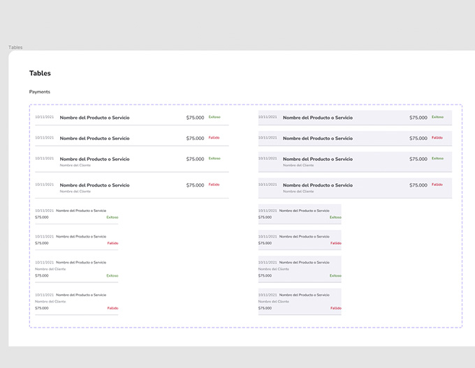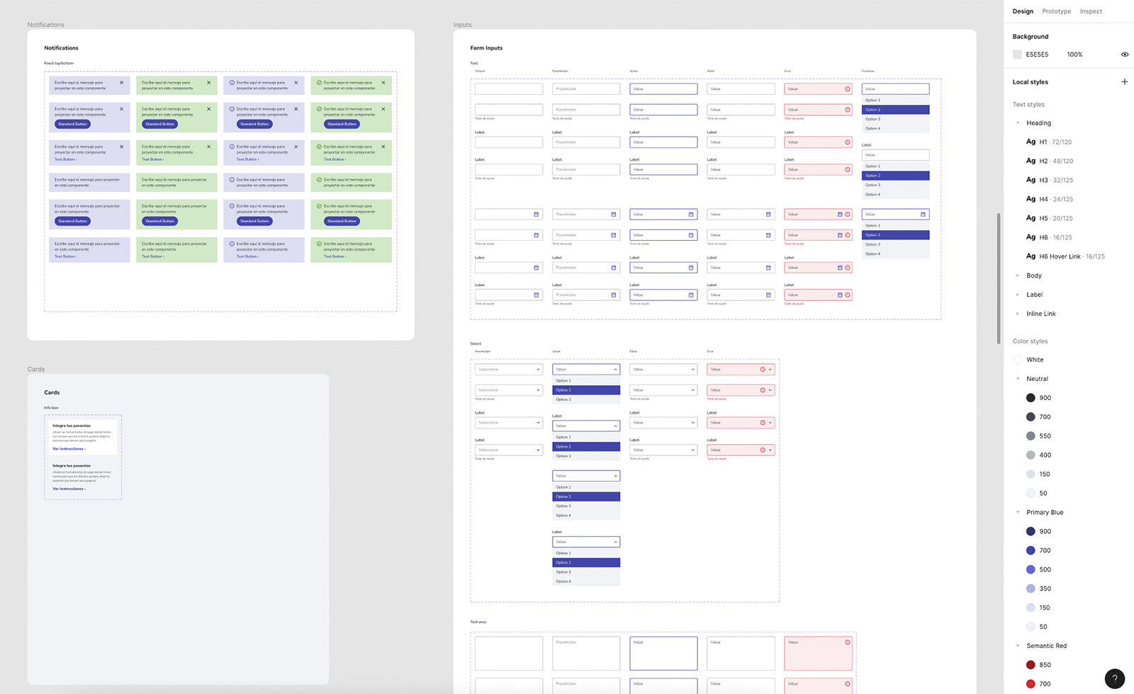 La definición de nuevos componentes y variantes de los mismos, se dio a medida en que avanzaba con el diseño y detectaba nuevas necesidades. Utilizando las funcionalidades de Figma para creación de componentes y variables, y aplicando dentro de los mismos propiedades de Autolayout, construí una serie de átomos y moléculas que optimizaban mi esfuerzo y garantizaban cohesión en el diseño.