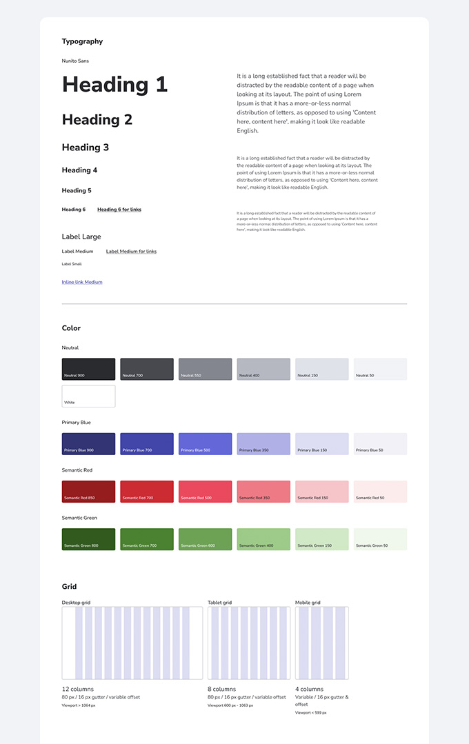 Siguiendo los principios del diseño atómico, definí los tokens o fundamentos que podrían constituir la interfaz gráfica de usuario. Las decisiones en tipografía, color y grilla estuvieron motivadas por la legibilidad, la accesibilidad, el control, la modularidad y la facilidad de mantenimiento.